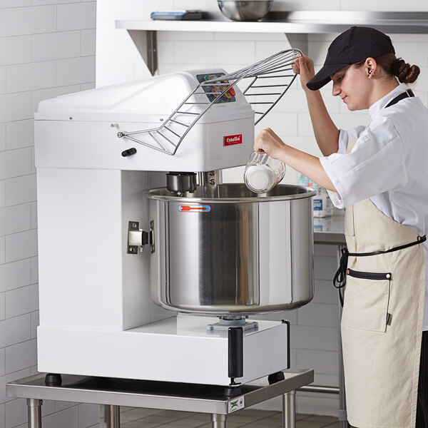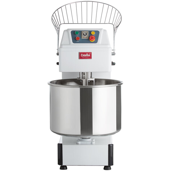 The Estella SM60 88 lb. spiral dough mixer will handle a range of dough products at your bakery, pizzeria, or restaurant. The Estella SM60 88 lb. mixer also features a steel grated lid that allows for ingredients such as flour to be added to the dough as it is mixing without having to shut it off. The grate also keeps employees from sticking their hands in the bowl when the mixer is on, improving safety.