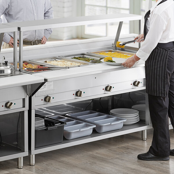 This kit includes (1) open well electric steam table and (1) angled sneeze guard. The steam table can hold four full size food pans (sold separately) full of pasta, meat, or side dishes in each 500W well. A 120V electrical connection is required for the 7 1/4′ power cord